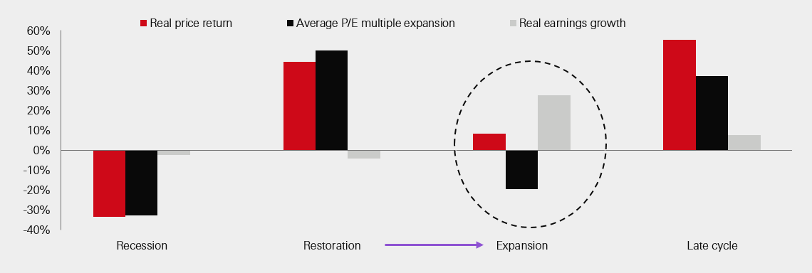 The expansion phase will bring a strong and growing economy, improving labour markets, and robust profits. However, the historic pattern is for lower total equity returns in mid-cycle relative to what investors earn during earlier, recovery phases. We should be realistic. After a period when rising investor optimism has lowered perceptions of risk and re-rated risky asset classes, the outlook is now for the reverse. Increasingly, valuations are set to become a drag on returns.