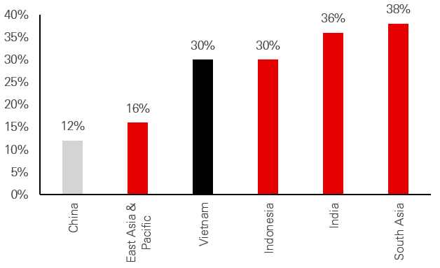 Currently, Vietnam’s inexpensive labour force does not boast high labour productivity. While manufacturing and trade has grown exponentially, local value-add remains low. Government investment in upskilling the workforce can be seen via steadily improving labour productivity. However, in the context of its Asian neighbours, more progress will be needed to capture greater value locally that supports opportunities for a more skilled workforce and insulates the country from competing supply chain locations.