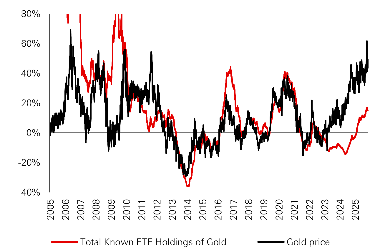 • Gold’s role in portfolios is shifting from a tactical hedge against inflation or falling real yields to a structural reserve asset, as its price has risen sharply even in an environment of high real rates and subdued inflation