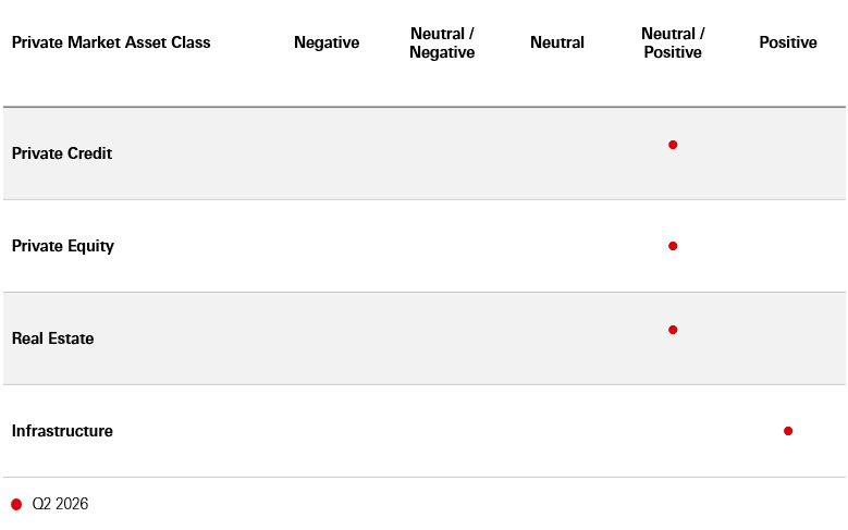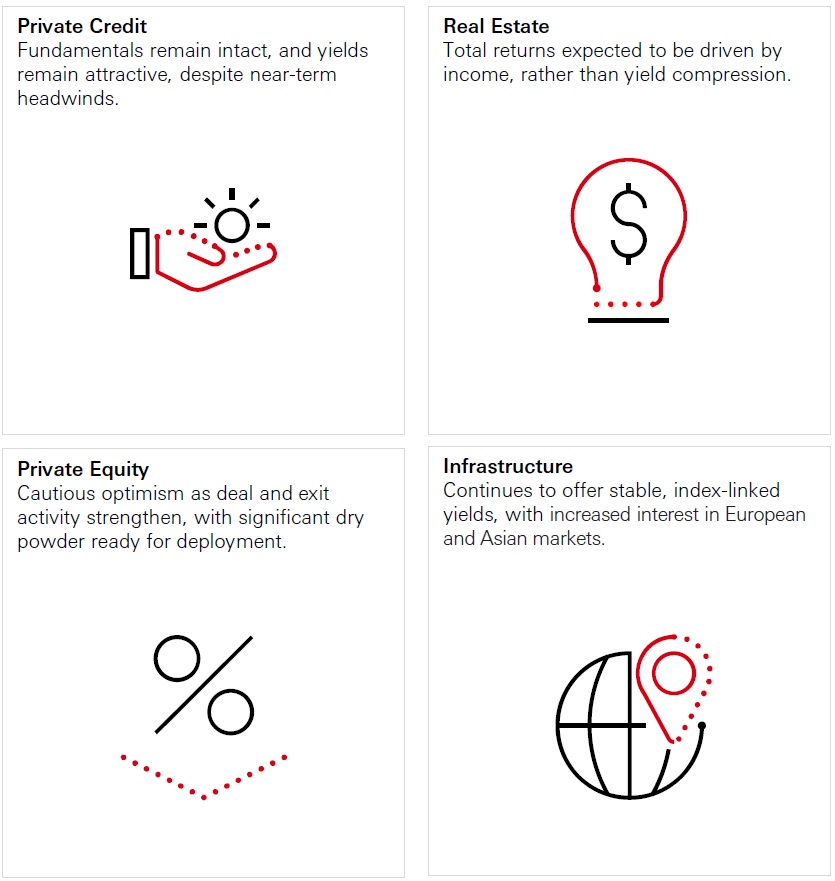 • In Real Estate, we hold a ‘Neutral / Positive’ outlook for the asset class. As investor sentiment has improved, investment volumes increased in 2025, driven by a strong end to the year. Total returns in Real Estate are expected to be driven by income, rather than yield compression as high-quality office and retail sectors are expected to perform particularly well