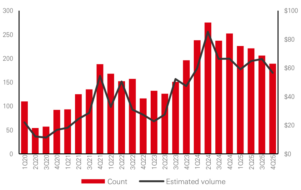 Private credit–financed deal activity in the US market slowed in Q4, with deal count down 25.0 per cent and volume down roughly 14.8 per cent year-over-year. With fewer deals supporting buyouts and M&A, the imbalance between demand for private credit and available supply continues to deepen.